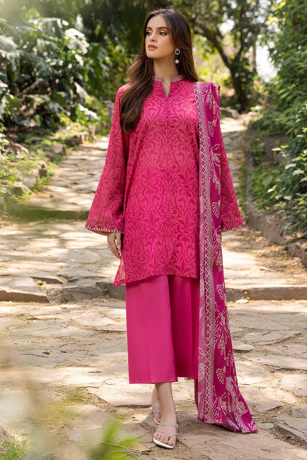 This beautiful outfit features a digital printed lawn shirt in a warm and elegant pinkish Red shade, paired with a digital printed voile dupatta that adds a touch of softness and sophistication. The look is completed with a dyed cotton trouser, providing a perfect blend of comfort and timeless style.
