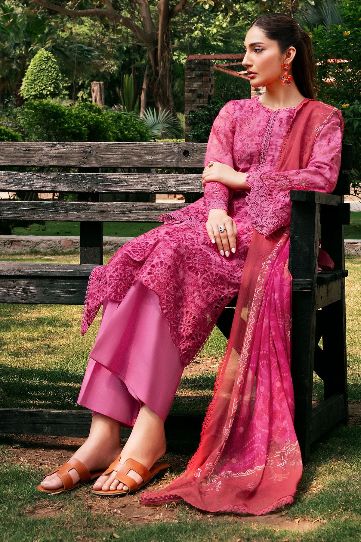 This elegant three-piece dress in a striking Pinkish Red shade features a beautifully crafted digital printed Schiffli embroidered lawn front, paired with a coordinating digital printed lawn back that adds depth and sophistication. The digital printed Schiffli embroidered lawn sleeves bring intricate detail and a cohesive design flow to the ensemble.