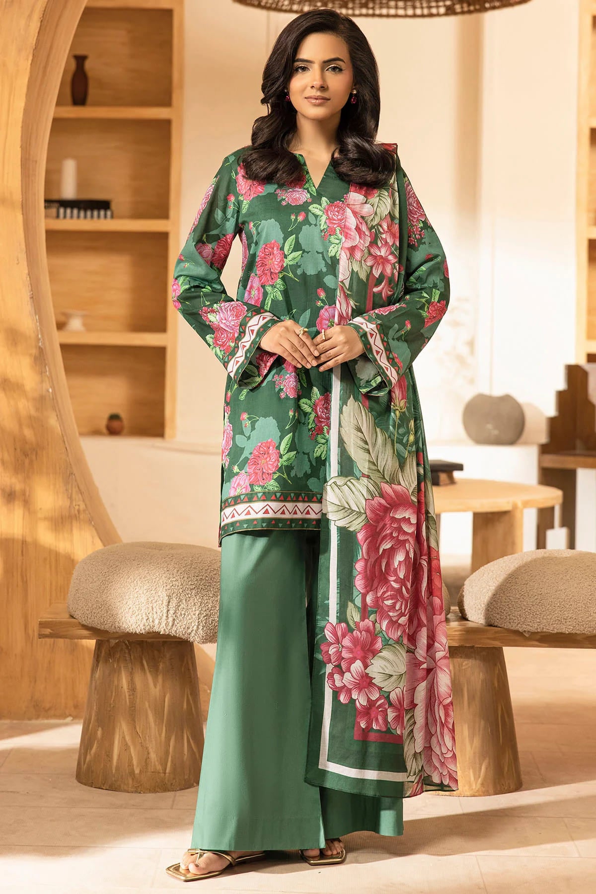 This elegant 3-piece ensemble in a refreshing Como Green shade features a digital printed lawn shirt, a breezy digital printed voil dupatta, and a dyed cotton trouser. Ideal for daytime gatherings or everyday wear, it offers a perfect mix of style and comfort.