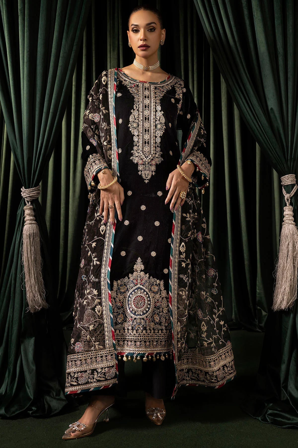 This luxurious 3-piece dress in black combines timeless elegance with intricate craftsmanship. The embroidered velvet front and dyed velvet back create a striking yet refined silhouette. Detailed embroidered patches for the front daman, along with embroidered velvet sleeves and additional embroidered sleeve patches, elevate the design. The embroidered organza dupatta with matching pallu patches adds a graceful touch, while the dyed silk trouser completes the ensemble. Perfect for a sophisticated, statement-making look at any special occasion.