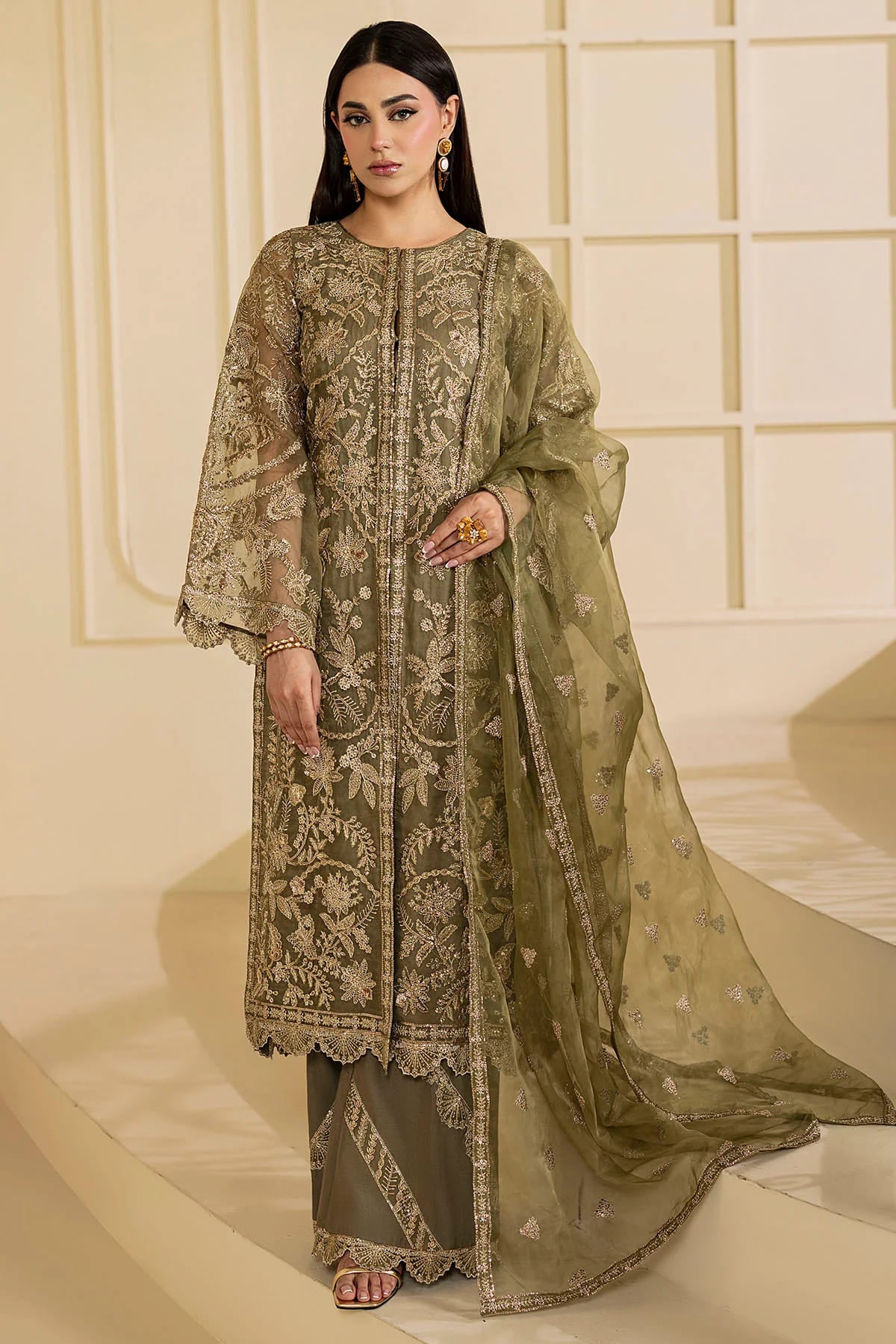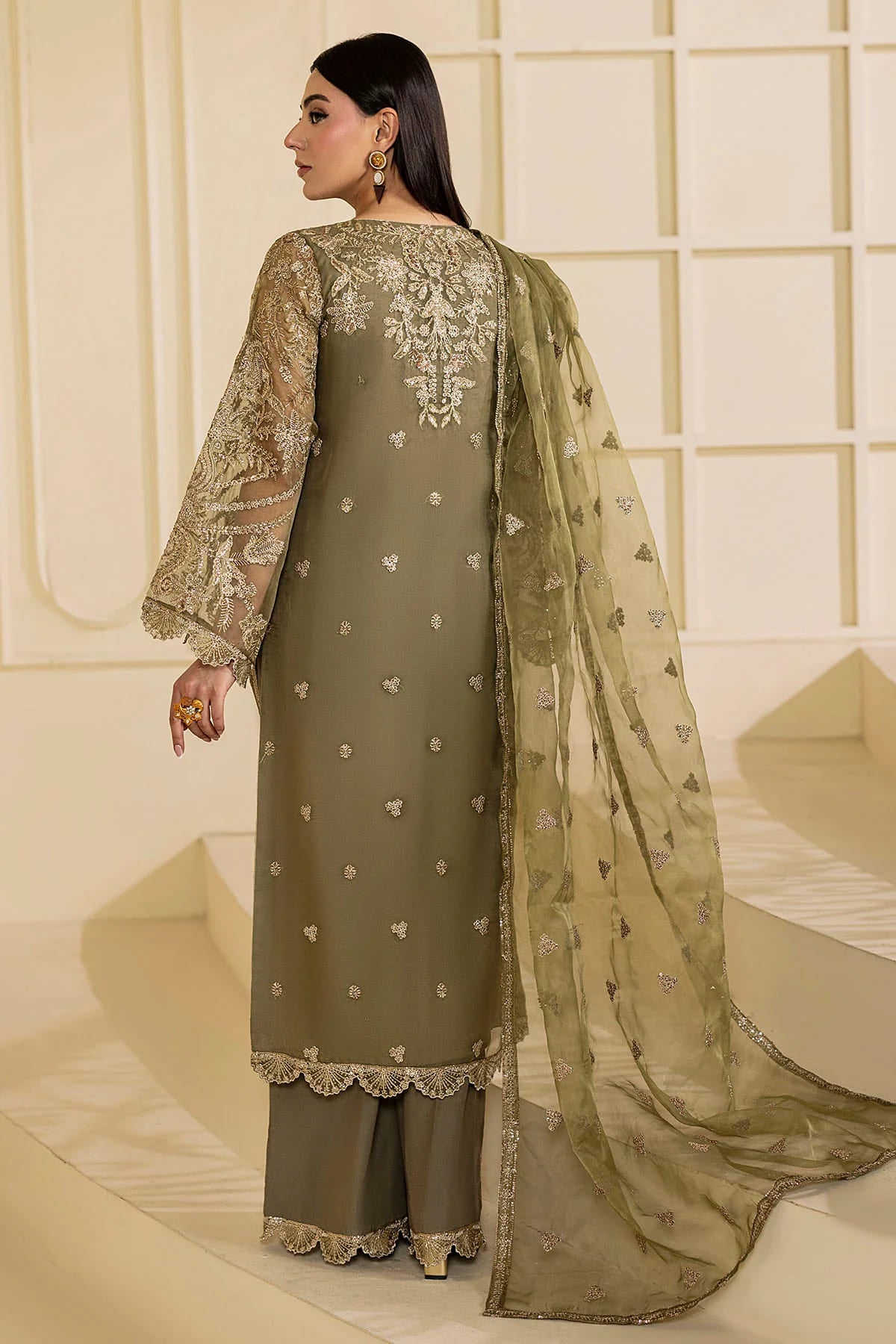 This exquisite three-piece ensemble in the graceful shade of Tobacco Green features an embroidered organza front and back, accentuated with finely detailed embroidered patches for the front and back daman. The organza sleeves come with beautifully crafted embroidered patches, enhancing the charm of the design. An embroidered organza dupatta adds elegance and sophistication, while the dyed silk trouser, paired with intricate embroidered patches, completes this luxurious and timeless outfit.