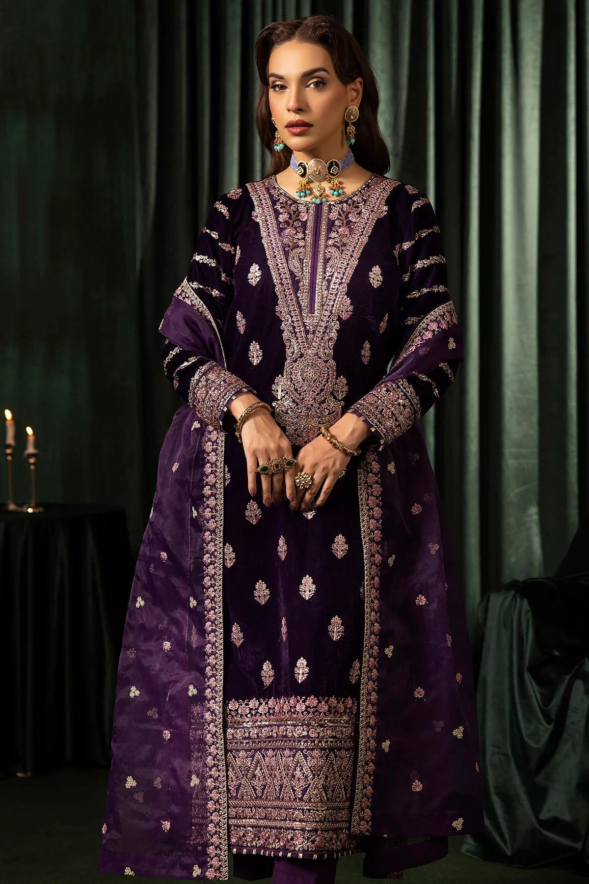 Elevate your wardrobe with this exquisite 3-piece embroidered velvet dress in the enchanting "Purply Magenta" shade. This ensemble includes an intricately embroidered velvet front and a dyed velvet back, highlighted with detailed neckline and daman patches for both the front and back. The velvet sleeves, adorned with embroidered patches, add a touch of refinement. The set is complemented by an embroidered organza dupatta with elegant pallu patches, and a dyed silk trouser to complete the look. Perfect for formal occasions, this outfit showcases unparalleled craftsmanship and timeless elegance.