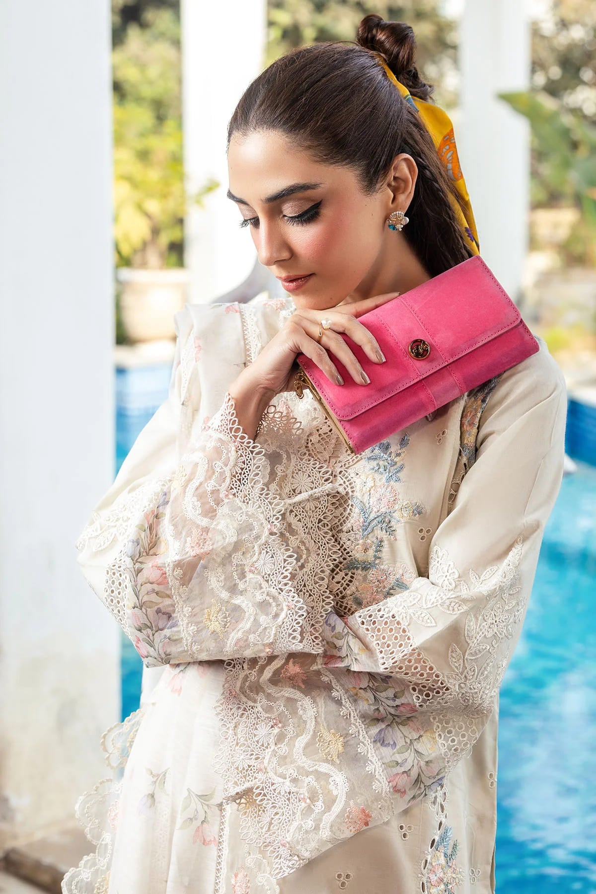 The dyed lawn sleeves are beautifully complemented by Schiffli embroidered sleeve patches, including a continuous design and additional patch detailing that elevate the overall look. A standout element of this ensemble is the printed and embroidered Munnar dupatta, richly adorned with a four-sided embroidered pallu patch, adding elegance and flair. Completing the outfit is a dyed cotton trouser, ensuring both comfort and style in this timeless and graceful attire.