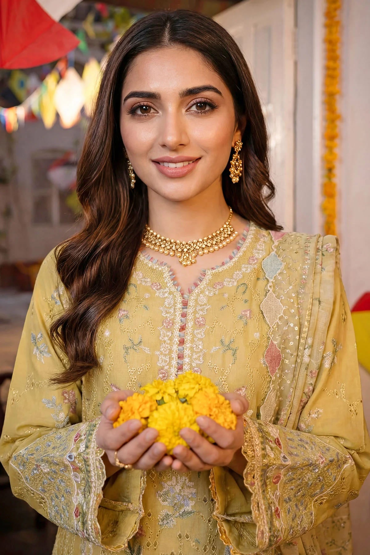 This elegant three-piece ensemble comes in the warm and graceful shade of Light Mustard, crafted from premium lawn fabric. It features a beautifully detailed Schiffli embroidered lawn front paired with a perfectly coordinated dyed lawn back. The design is enhanced with intricately crafted embroidered patches for the front and back daman, adding depth and refined elegance. The look is further elevated with Schiffli embroidered lawn sleeves, finished with delicately designed embroidered sleeve patches for a polished finish. A stunning printed embroidered Munnar dupatta, complemented with embroidered pallu patches, adds charm and sophistication, while a dyed cotton trouser completes this timeless and stylish outfit.