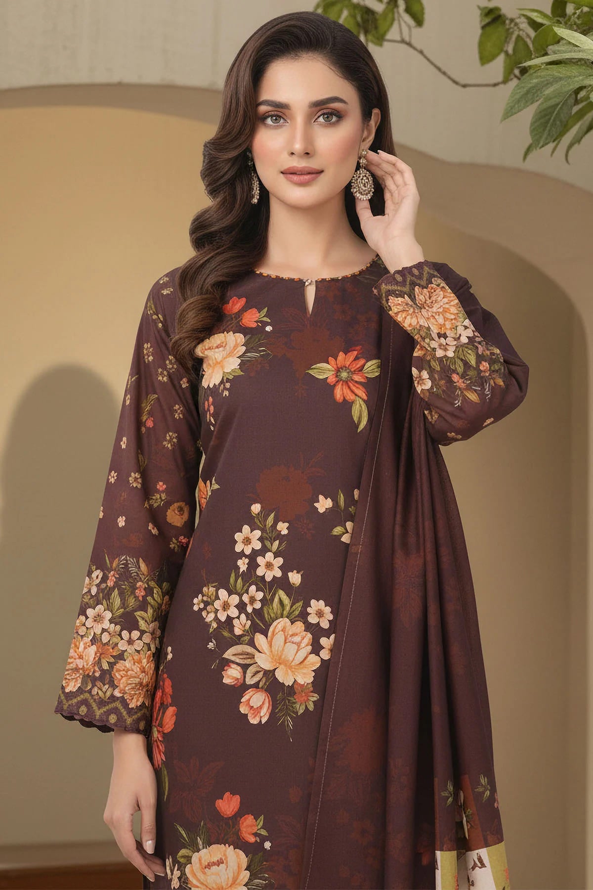 This premium three-piece ensemble comes in the rich and elegant shade of Special Brown, crafted from high-quality khaddar. It features a stylish printed premium khaddar shirt, paired with a beautifully coordinated printed premium khaddar shawl that adds warmth and sophistication. The look is completed with a soft dyed premium khaddar trouser, offering comfort and refined elegance—perfect for a graceful and seasonal wardrobe.