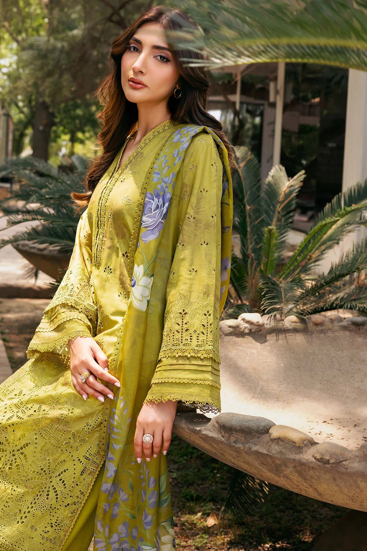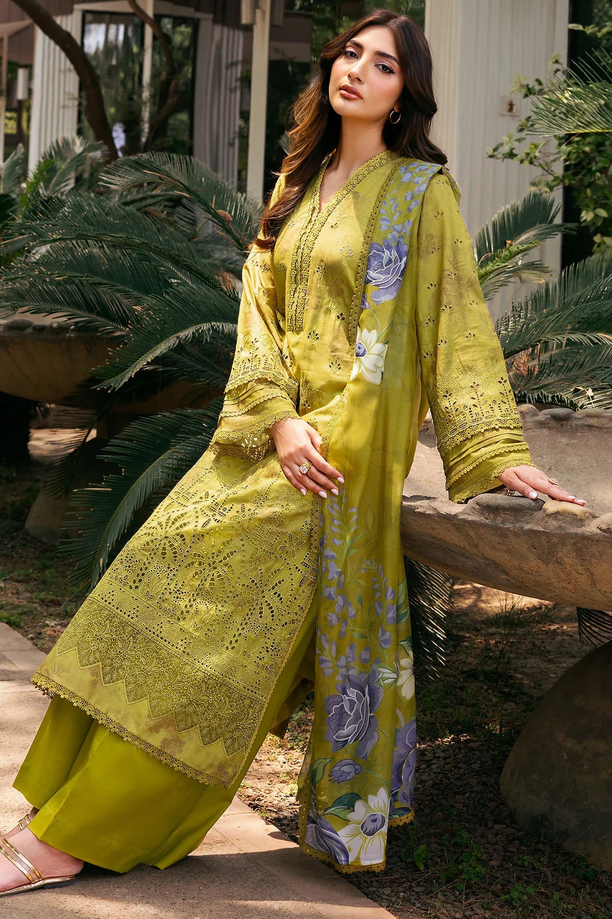 The digital printed Schiffli embroidered lawn sleeves complement the design with seamless artistry, while the printed tissue silk dupatta adds a soft, luxurious touch to the ensemble. Finished with a dyed cotton trouser for all-day comfort and elegance, this outfit strikes the perfect balance between heritage and contemporary style.