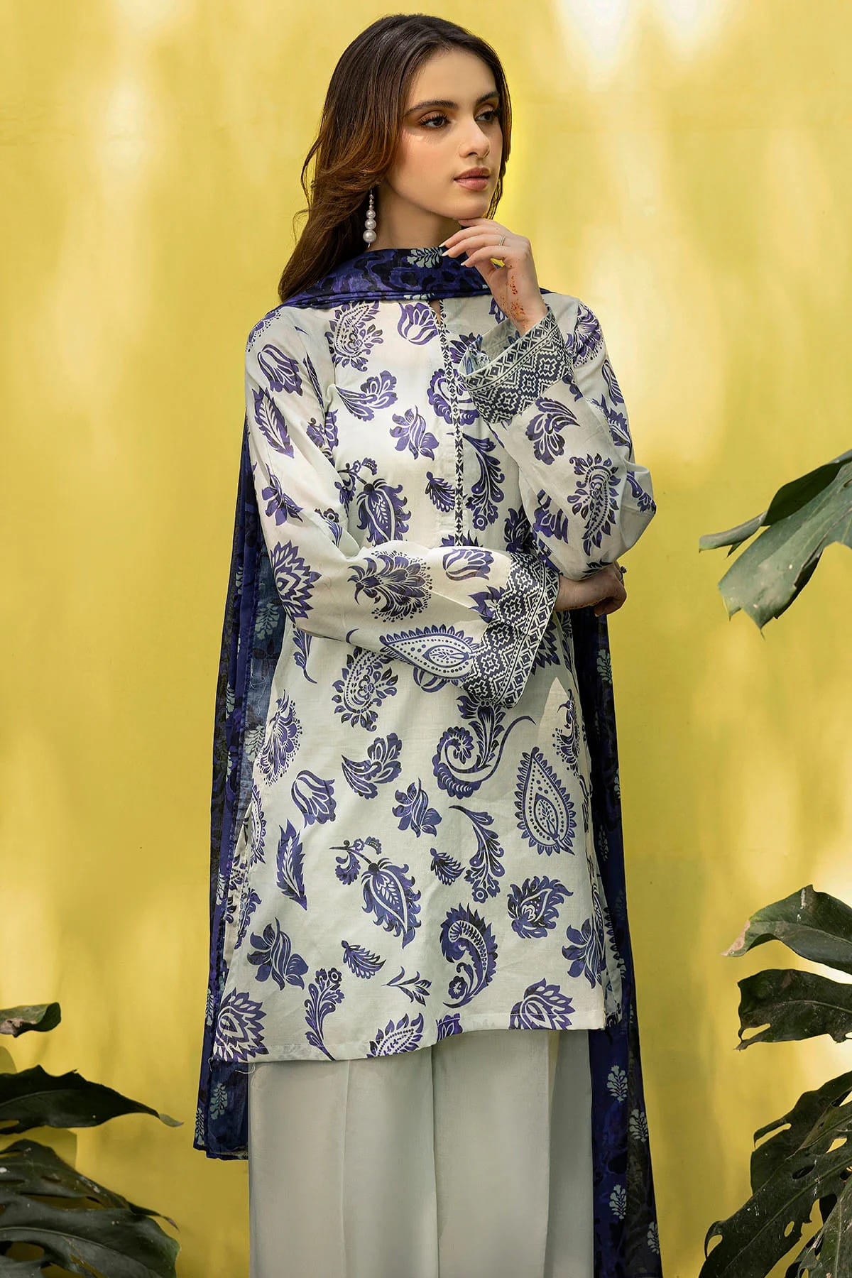 This elegant outfit features a digital printed lawn shirt in a soft pastel grey shade, paired with a digital printed voile dupatta that adds a touch of sophistication and charm. Completing the ensemble is a dyed cotton trouser, offering a perfect balance of comfort and style for a refined, graceful look.