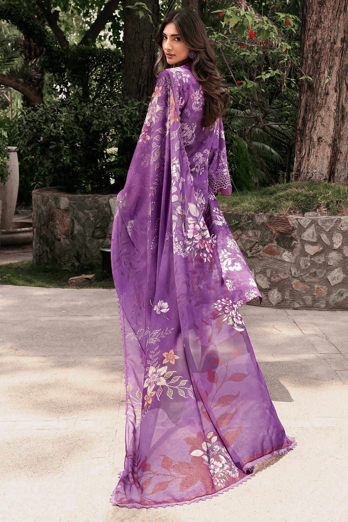 This elegant three-piece ensemble comes in a refined shade of Dark Lavender, featuring a digital printed Schiffli embroidered lawn front paired with a matching digital printed lawn back. The look is further enhanced with a delicate Schiffli embroidered patch for the front daman, adding timeless charm. The digital printed Schiffli embroidered lawn sleeves bring subtle intricacy, perfectly complemented by a flowing digital printed crinkle chiffon dupatta. Completing the set, a dyed cotton trouser balances the outfit, making it a graceful choice for effortless sophistication.