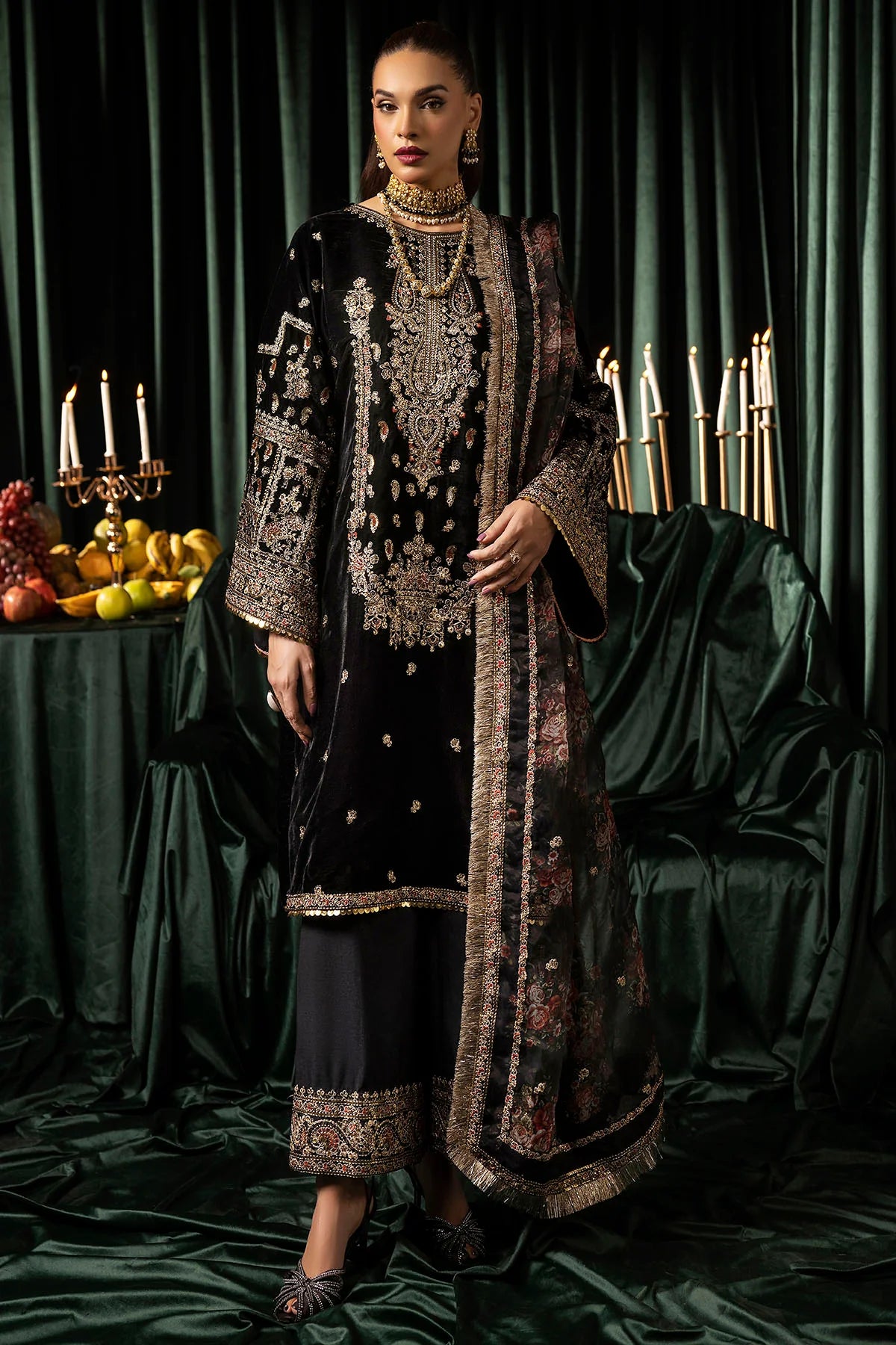 Step into elegance with this stunning 3-piece embroidered velvet dress in classic black, a perfect blend of sophistication and style. Featuring an embroidered velvet front and dyed velvet back, the outfit is enriched with an intricately designed daman patch. The velvet sleeves, adorned with embroidered patches, add a regal touch. A printed and embroidered organza dupatta with detailed pallu patches enhances the ensemble’s charm. Completing the set is a dyed silk trouser accentuated with an embroidered patch, making this outfit a standout choice for your formal wardrobe.